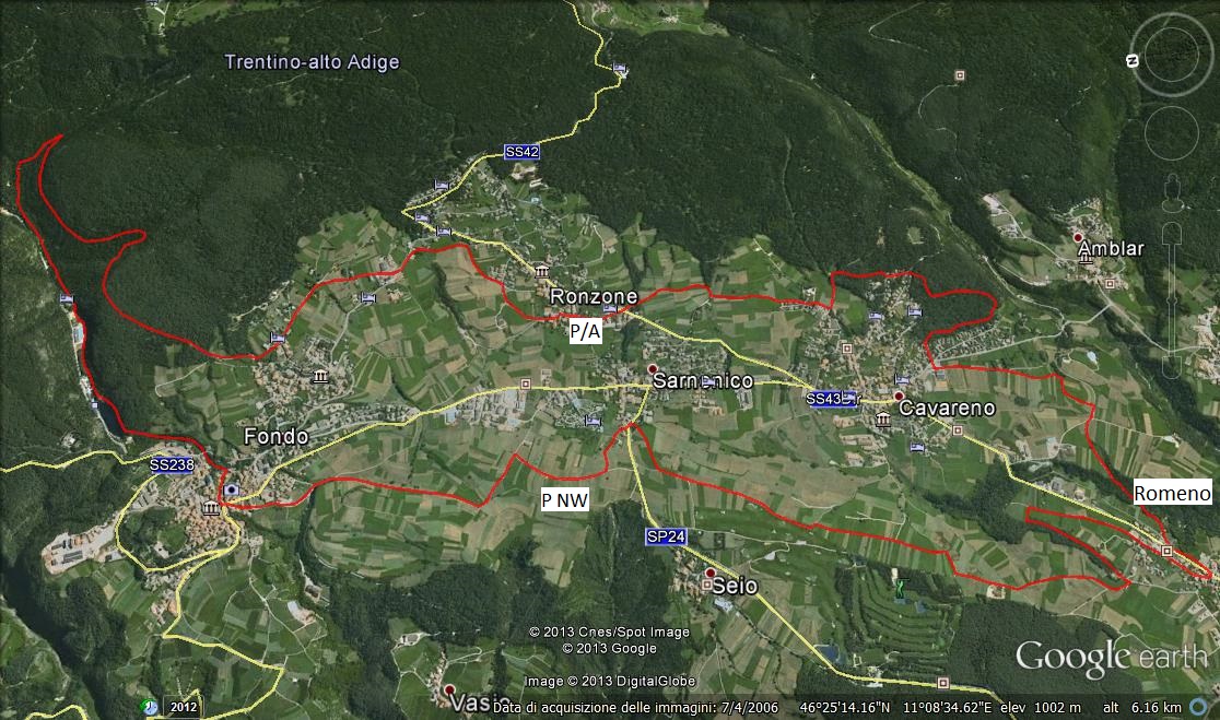 Con questo articolo pubblichiamo la cartina del percorso preciso di quest'anno. Con "P/A" è indicata la partenza e l'arrivo (musei di Ronzone) e con "P NW" è indicata la partenza Nordic Walking.